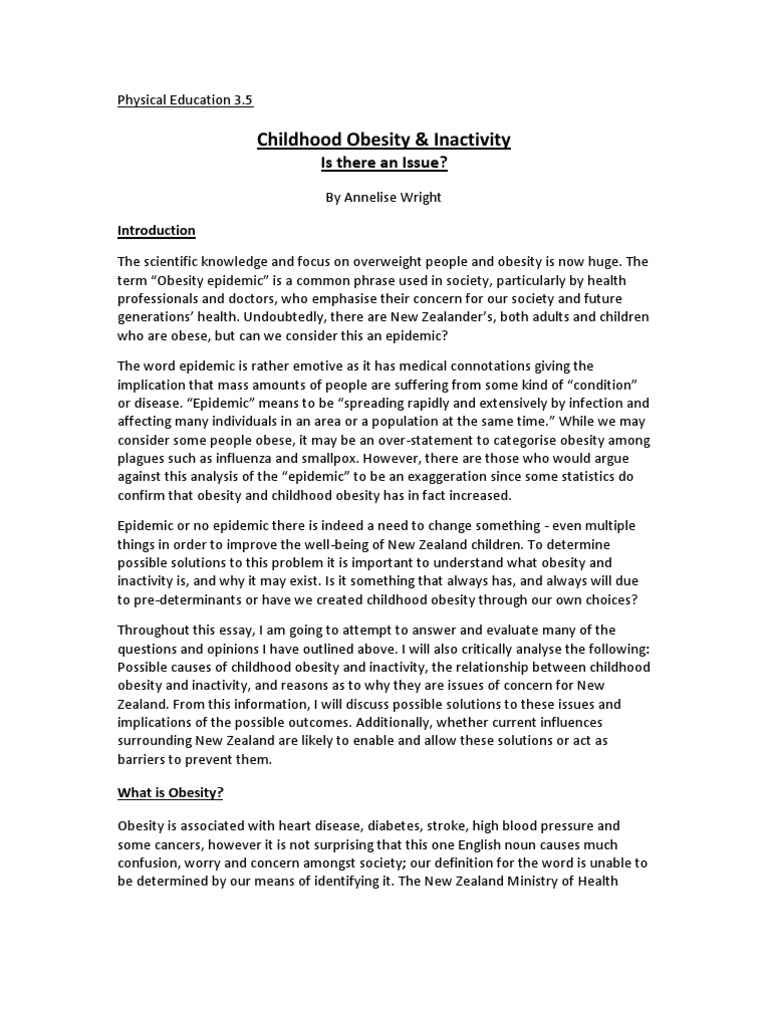 Get the huge list of more than Essay Topics and Ideas. Conclusion of Importance of Exercise Essay. In order to live life healthily, it is essential to exercise for mental and physical development. Thus, exercise is important for the overall growth of a person. It is essential to maintain a balance between work, rest and activities Persuasive Essay On Childhood Obesity Words | 6 Pages. Parents need help from the government to help make changes in the environment that children grow up in. such as, limiting the unhealthy advertisements targeted at children, creating safe places for children to place and exercise, and encouraging parents to prepare nutritious meals for their children as opposed to fast food (Childhood The format of an obesity essay is similar to writing any other essay. If you need help regarding how to write an obesity essay, it is the same as writing any other essay. Obesity Essay Introduction. The trick is to start your essay with an interesting and catchy sentence. This will help attract the reader's attention and motivate them to read